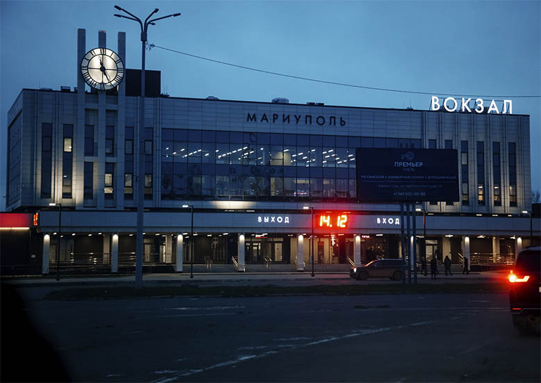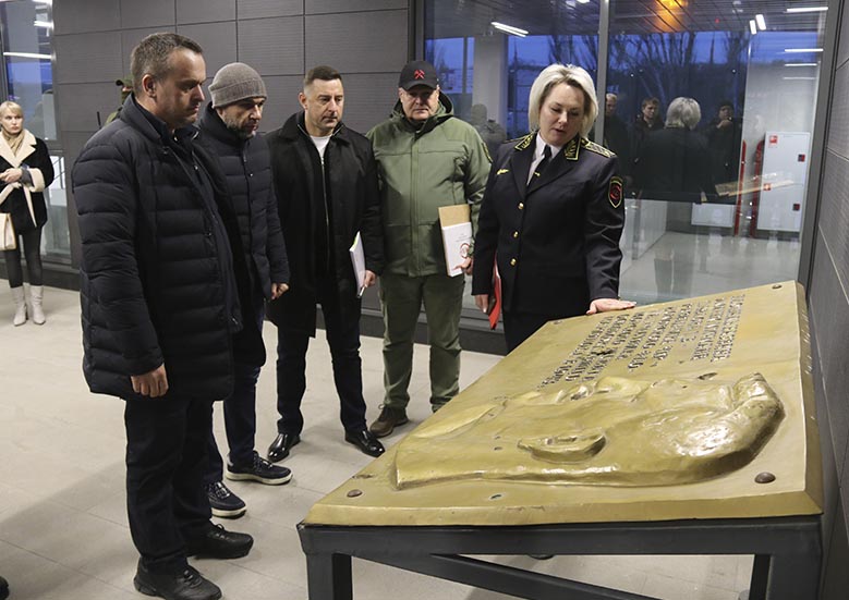 На входе в вокзал министру продемонстрировали единственное, что уцелело от фасада прежнего здания вокзала - мемориальную доску со следами от осколков. Памятник посвящен разведчику черноморского флота мичману Е.В. Павлову, участнику морского десанта, освободившего Мариуполь в 1943 году.
