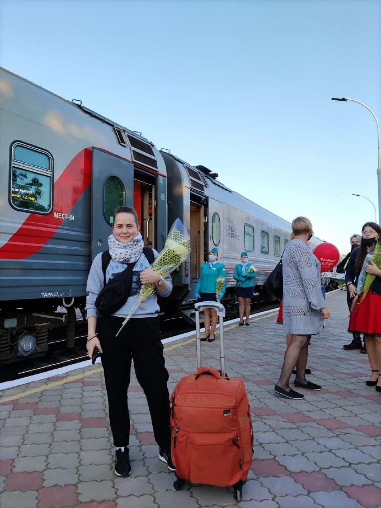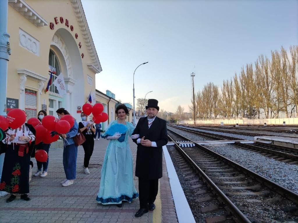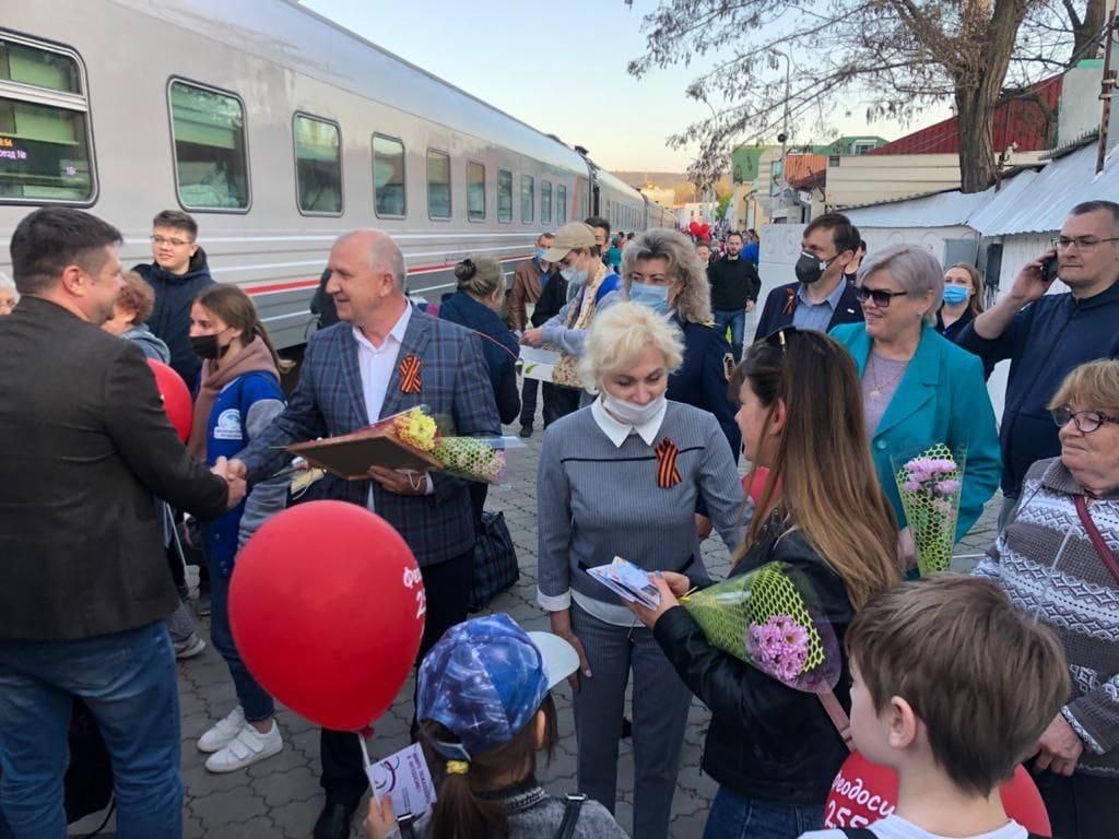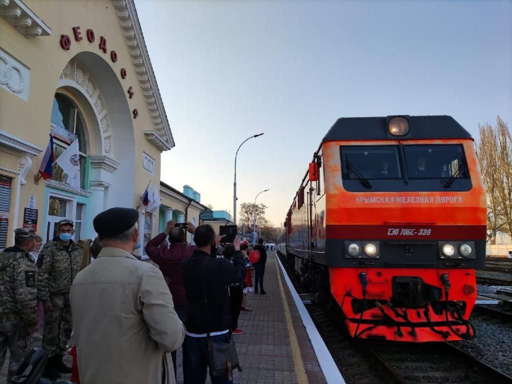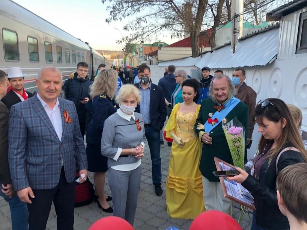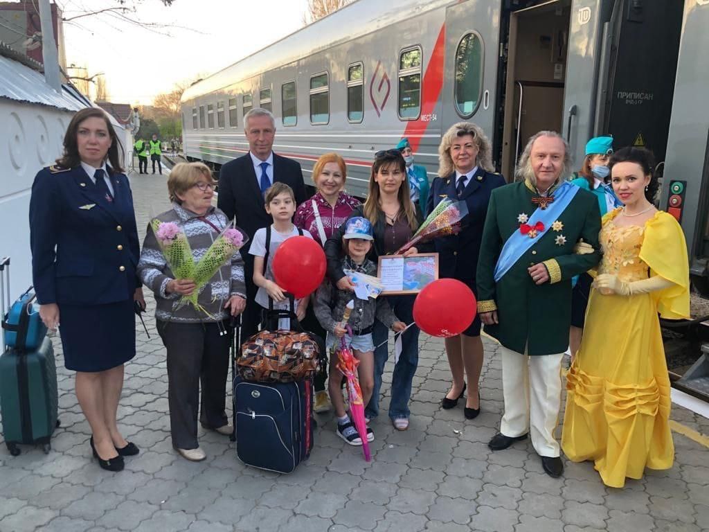 На вокзале была организована торжественная встреча пассажиров, прибывших первым поездом: на перроне их встречали организаторы и волонтеры. А перед прибытием поезда на платформе развернулась театрализованная постановка “Айвазовский. Первый поезд в Феодосии”. Пассажиров приветствовали известный художник-маринист Иван Айвазовский и министр путей сообщения Сергей Витте.
