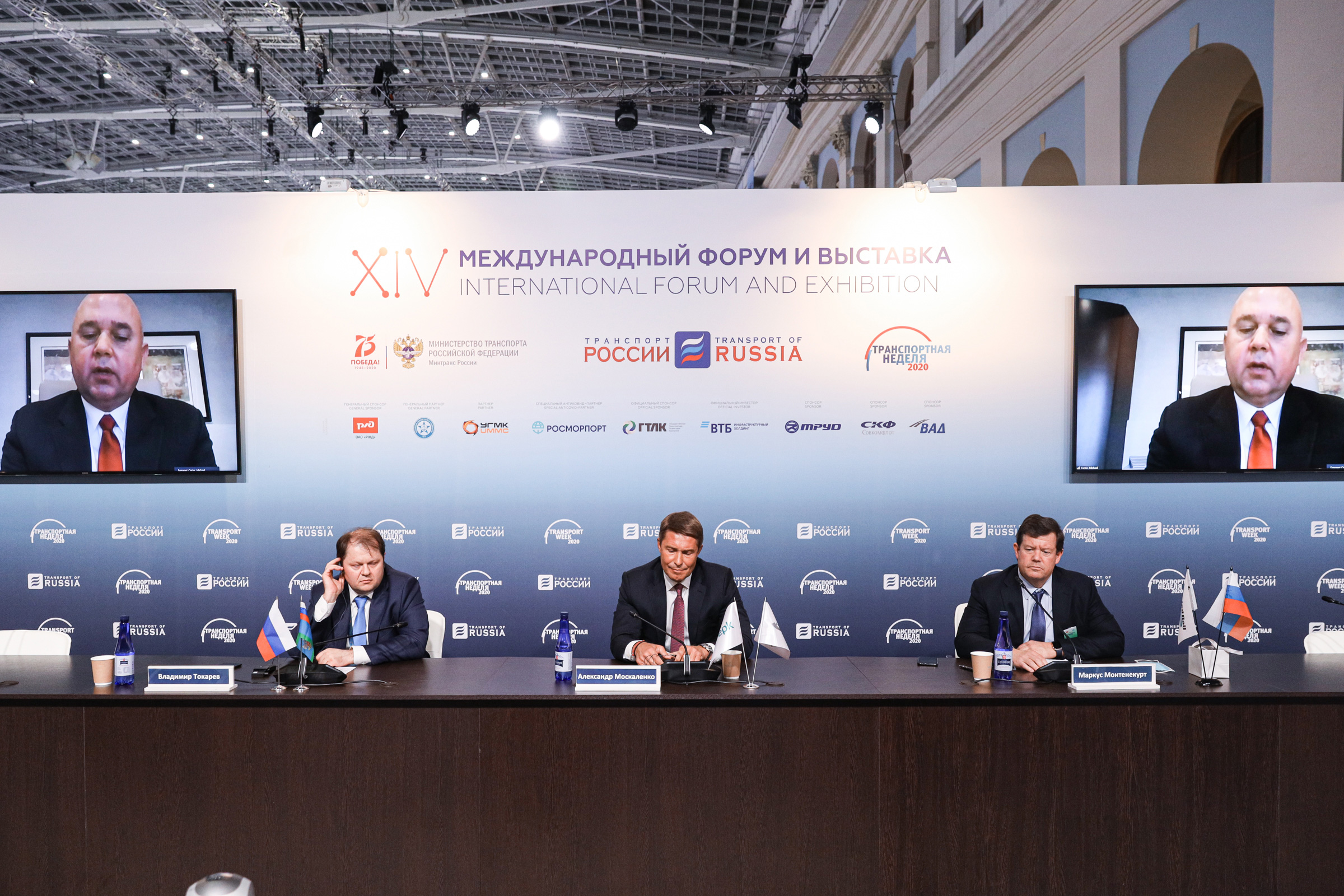Замминистра транспорта—руководитель Росжелдора Владимир Токарев, председатель правления ЕПК Александр Москаленко, вице-президент Amsted Rail Маркус Монтенекурт; на экране — президент Amsted Rail Company Майкл Картер